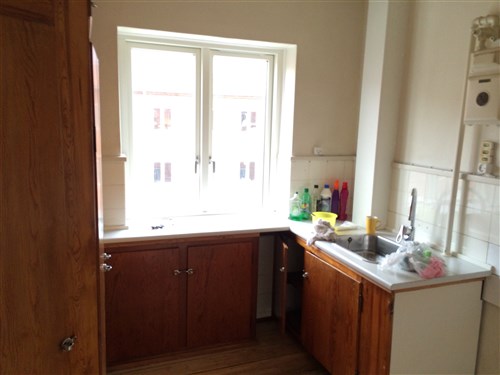 Frisk dit gamle køkken op med nye greb.. Rengør alle overflader grundigt, vask efter med rent, varmt vand og tør over med microfiberklud. Slib de våde låger med en våd slibesvamp. Det kan gøres på en formiddag,og kan klares for i hvert fald under 500 kroner, hvis ikke dit køkken er markant større end gennemsnittet. Dette projekt kan give et kæmpe løft til køkkenet,.